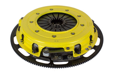 T2R-F04 race, twin disc kit offers twice the number of disc surfaces for better wear, heat capacity and long life compared to single disc kits. These kits use a proprietary Positive Lift Floater System design, which results in quiet operation with no floater rattle and no posts to wear. ACT twin disc kits undergo an exclusive four-stage, heat-treating process on all diaphragms. The ACT twin disc features the ability to adjust for disc wear and provides equal disengagement for discs. ACT's 6-pad rigid race discs are made with high quality, ceramic friction materials. The chrome-moly hub is heat-treated for strength and durability. The lightweight, rigid design allows for quicker shifts and trouble-free service. All ACT twin disc kits include a CNC-machined and dynamically balanced flywheel to ensure trouble-free installation and operation. ACT twin disc kits include a pressure plate, two discs, a floater, flywheel and alignment tool. Some kits may include a pilot bearing and release bearing.
