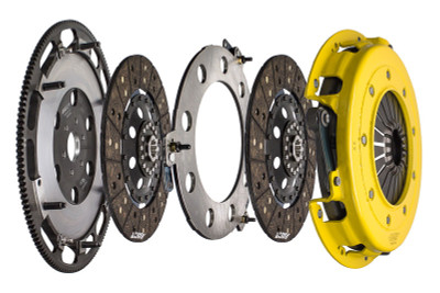 T2S-F02 street twin disc kit offers twice the number of disc surfaces for better wear, heat capacity and long life compared to single disc kits. These kits use a proprietary Positive Lift Floater System design, which results in quiet operation with no floater rattle and no posts to wear. ACT twin disc kits undergo an exclusive four-stage, heat treating process on all diaphragms. The ACT twin disc features the ability to adjust for disc wear and provides equal disengagement for discs. The ACT Performance street rigid-hub discs feature premium organic materials with high copper content for better heat transfer and steel-backed lining for greater burst strength and durability. The chrome-moly hub is heat-treated for strength and durability. Rivet design and materials are carefully selected for maximum strength. All ACT twin disc kits include a CNC-machined and dynamically balanced flywheel to ensure trouble-free installation and operation. ACT twin disc kits include a pressure plate, two discs, a floater, flywheel and alignment tool. Some kits may include a pilot bearing and release bearing.