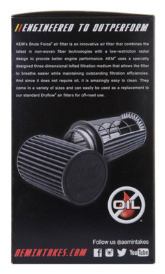 AEM Dryflow Air Filters are washable synthetic air filters designed for an optimum combination of air flow, filtration, and performance. AEM Dryflow filters use an innovative high performance oil-free filtration material that allows easy cleaning, durable service, and excellent filtration. Replacement air filters for street vehicles come with a lifetime limited warranty. Other air filters come with a one year limited warranty.