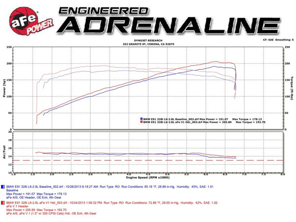 aFe POWER Twisted Steel Long Tube Headers are constructed of near equal length 1-1/2 IN 16-gauge 304 stainless steel tubing with thick flanges to ensure a leak free seal. To eliminate dead space that can cause turbulence and hinder flow that formed collectors are prone to produce, true merge collectors and optimized tube lengths are used for true pulse control technology improving flow and performance. 100% TIG-welded, the smooth curves and increased diameter of this header helps remove restriction and keeps exhaust gas flowing smoothly for improved performance and durability. It uses dual, high flow, 300 CPSI metallic catalytic converters for maximum flow providing an astonishing low end torque improvement. All components are supplied for a hassle-free installation with no modifications necessary. 100% TIG-welded by certified craftsmen for race proven strength and durability. TIG-welding provides the strongest welds reducing stress cracks. The ceramic 300 CPSI metallic catalyst is designed for maximum surface area and flow. aFe has designed this system to retain all your factory sensors for a hassle free installation. Also included are 6 O-ring header flange gaskets. Mitered collectors not only extend the tube lengths and decrease turbulence, but provide optimal exhaust scavenging. The result is increased horsepower, torque and improved throttle response. These headers are constructed of durable CNC mandrel bent brushed 304 stainless steel tubing for maximum performance, corrosion resistance and strength eliminating cracking.
