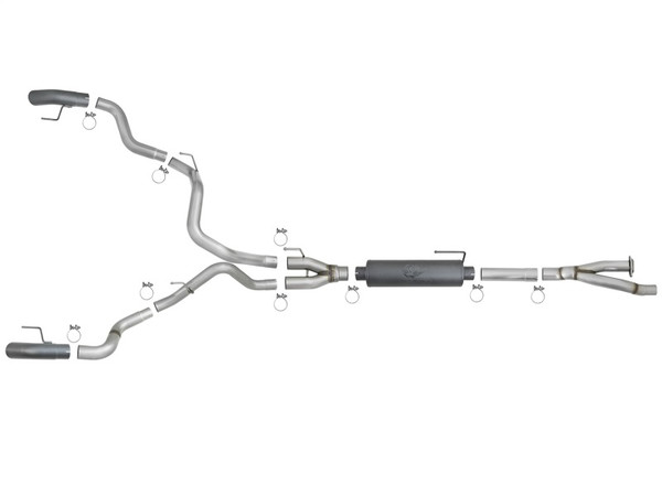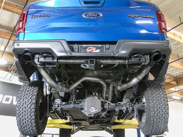 aFe is proud to introduce the MACH Force-Xp "Hi-Tuck" Cat-Back exhaust system for the 2017 Ford F-150 Raptor with the V6-3.5L EcoBoost twin-turbo engine. This exhaust system outflows the factory exhaust. This cat-back exhaust is constructed of 3" into 3-1/2" mandrel-bent 304 stainless steel tubing and comes complete with free-flowing high temp metallic black powder-coated muffler, OE-style bayonet hangers, band clamps and necessary hardware for a hassle-free installation. The smooth curves and increased diameter of this exhaust system helps remove restriction and keeps exhaust gas flowing smoothly for increased horsepower and torque. The system is finished off with a dual 304 stainless steel, single wall slash cut tips for an aggressive style. Hi-Tuck: This exhaust system is finished off with Hi-Tuck tips that are developed to give you extra clearance during extreme angle climbs or descents. Gives the truck an "Old School" traditional look. Installation is a Snap: This MACH Force-Xp exhaust system use all factory mounting locations providing stability and a hassle-free installation. Leak-Free Seal: High quality band clamps are used for a complete 360-degree sealing surface eliminating leak paths. Aggressive Sound: A free-flowing stainless steel high temp 24" length muffler is used to absorb high pitch tones producing a powerful sound and unleashing all available horsepower and torque. Dual 4" Tips: Finishing off this system are dual 4" diameter, 304 stainless steel tips. This is a dual rear exit system. Y-Merge Assemblies: The Y-merge assemblies evenly distributes exhaust pulses and minimizes exhaust drone to enhance the tone. Perfect Fit: OE-style bayonet hangers are used to maintain a stable pipe location during high vibration and high heat conditions. The Bayone t tip holds the hanger bushing in place for an OE style fit that does not change with time.