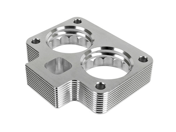 Silver Bullet throttle body spacers create turbulence in the air flow at the point just prior entry into the engine increasing horsepower, torque and improving throttle response and fuel efficiency. Silver Bullet throttle body spacers are constructed out of durable T-6061 billet aluminum and using a unique serrated/helix entry to create turbulence at the manifold while eliminating the annoying whistle found in other helix only throttle spacers.