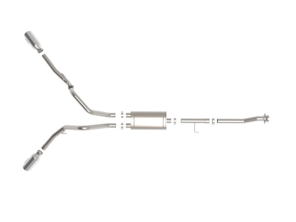 This cat-back exhaust system is constructed of 3 IN mandrel-bent 304 stainless steel tubing for maximum strength and durability. This system features a high-flow 409 stainless steel muffler, producing a aggressive sound. Finishing off this exhaust system are dual 4-1/2 IN diameter polished 304 stainless steel clamp-on exhaust tips. The tips features an aFe POWER logo plate riveted on for a unique style. This system produces an aggressive sound unleashing all available horsepower and torque. Utilizing a factory style flange and hangers this system is a direct bolt-on system, which requires no cutting or modifications for a hassle-free installation. Utilizing state-of-the-art computer-aided design technology, this exhaust system is designed for custom, high tolerance factory fitment. 100% MIG-Welded for race-proven strength and durability.