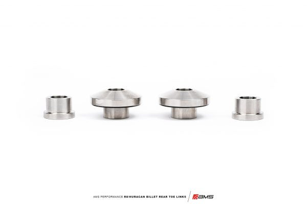 The AMS Performance R8/Huracan Billet Rear Toe Links offer a huge improvement in rigidity over the weak OEM links. Where the factory links have deflection in their rubber bushings, the heim joints of the AMS Billet Rear Toe Links provide a solid connection, free of flex. During our track testing we have found that the factory toe links will deflect and cause a toe misalignment condition during launch under heavy acceleration, due to the pliable bushings used. The AMS Billet Rear Toe Links with spherical bearing heim joints will not have any deflection, and provide a static alignment setting and increased traction and stability.