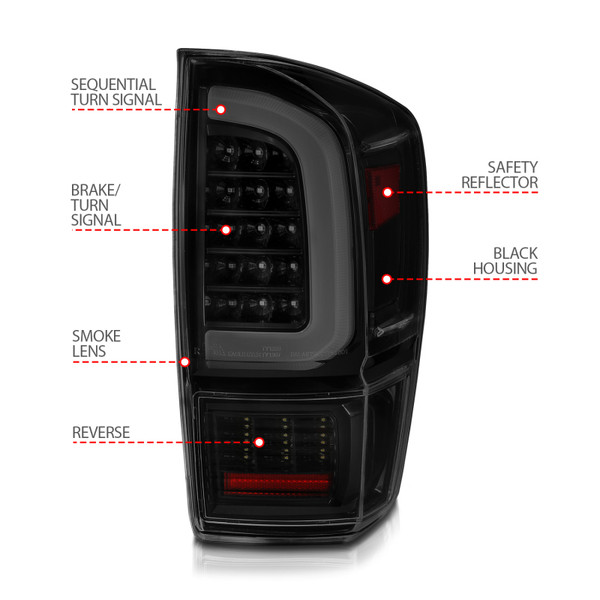 ANZO 16-21 Toyota Tacoma LED Tail Lights - w/ Light Bar Sequential Black Housing & Smoke Lens - 311401