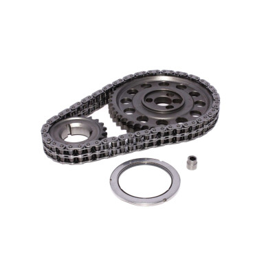 Cast iron camshaft gear and induction hardened billet steel crank sprocket; Features 3 keyway crank sprocket for 4-degree incremental adjustability, 4-degreemaximum advance/retard; Pre-stretched, heat-treated double roller chain with heavy-duty large pin design; chain available separately; Dynamically balanced and quality checked for run-out tolerances; Ideal for all street performance and race applications
