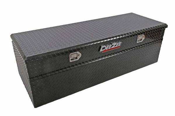 Dee Zee Tool Box - Red Label Chest. Constructed of heavy duty Brite-Tread aluminum. Black-Tread powder coat, provides a gloss black finish while it protects and prevents oxidation. Crown style lid with a full pan double-V stiffener for superior rigidity. Slanted front design to clear wheel well impact. Other features: lockable stainless steel paddle handles, dampened gas shocks, closed cell foam gasket, and self-adjusting strikers. Removable plastic tool tray to help keep small items organized.