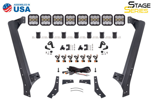 Included in the box: Two (2) Application-specific heavy-duty steel brackets for installation on 2007-2018 Jeep Wrangler. Eight (8) Stage Series 5inch LED Pods. Seven (7) CrossLinks with hardware. Two (2) CrossLink supports. One (1) CrossLink endmount kit. Seven (7) splitter wires. One (1) OEM auxiliary switch single-output harness. One (1) heavy-duty single-output harness. Installation Guide.
