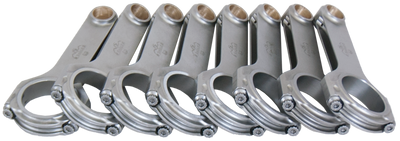 Eagle's 4th Generation H-Beam rods are forged from ASME certified 4340 steel in a two-piece forging and feature a fully machined and shot-peened surface. Eagle's 4th Generation design features thicker beam webbing for increased power handling capabilities, Increased beam and cap contact area and shoulder area to inprove bore stability under high load, and new small end profile to reduce reciprocating weight. Sizing is held to exact tolerances. Sold as a weight-matched set. Equipped with ARP 2000 bolts. Recommended for competition use.