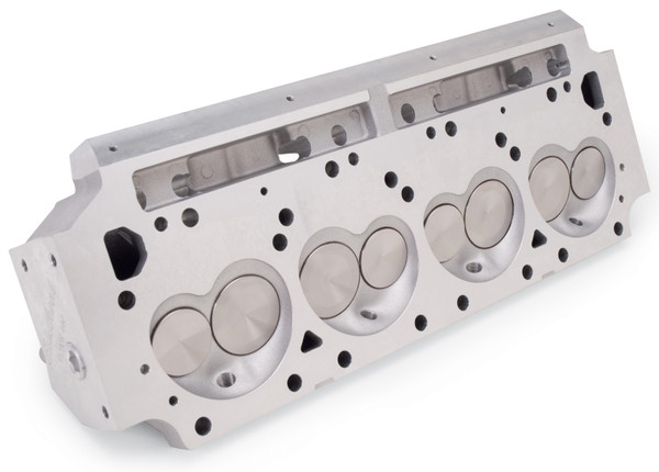 Cylinder Head Specifications: Combustion chamber volume:-?72cc, Intake runner volume:-?280cc /290cc (Raised .650in), Exhaust runner volume:-?100cc (Raised .250in), Intake valve diameter:-?2.20in, Exhaust valve diameter:-?1.81in, Valve stem diameter:-?11/32in, Valve guides:-?Manganese bronze, Deck thickness:-?5/8in, Pushrod diameter:-?3/8in, Valve angle:-?15, Exhaust port location:-?Raised .250in, Spark plug fitment:-?14mm x 3/4 reach, gasket seat. INSTALLATION NOTE: For headers, contact TTI (951) 371-4878. Offset intake rockers required, exhaust side accepts standard-spec rockers. May require additional pushrod hole clearance for some combinations. Bare heads will have valve guides and seats installed, but will require final sizing and a valve job to match the valves you will be using. These heads require the use of a 14mm x 3/4in reach, flat gasket spark plug with a heat range appropriate to your application. Deck thickness: 5/8in, pushrod diameter: 3/8in.