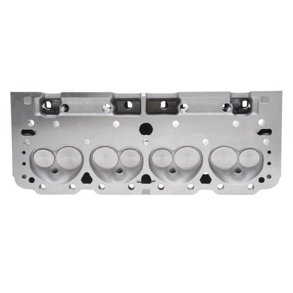 Cyl Head Specifications: Combustion chamber vol: 64cc; Intake runner vol: 170cc; Exhaust runner vol: 70cc; Intake valve dia: 1.94"; Exhaust valve dia: 1.55"; Valve stem dia: 11/32"; Valve guides: Maganese bronze; Deck thickness: 5/8"; Valve spring diameter: 1.46"; Valve spring maximum lift: .575"; Rocker stud: 3/8"; Pushrod diameter: 5/16"; Valve angle: 23°; Exhaust port location: Stock; Spark plug fitment: 14mm x .750 reach, gasket seat. * Edelbrock E-Tec Cylinder Heads are replacements for 302, 327, 350 & 400 c.i.d. S/B Chevy engines with "Vortec-style" manifolds. They feature an LT1-style raised runner intake port design for increased air-flow and ultimate performance. A unique combustion chamber design positions the spark plug closer to the center of the cylinder, promoting a more efficient combustion resulting in more power. These cylinder heads include an adjustable rocker stud and guide plate set-up for use with adjustable rockers or washers to properly position the stud height to accommodate factory style self-aligning rocker arms. They have 20% more exhaust flow than cast iron Vortec heads, great performance up to 6000 rpm and can produce 9.5:1 compression with stock pistons in 350 cubic-inch engines. RPM E-Tec heads are dual-drilled and will accept 1987-95 centerbolt and/or 1986 & prior perimeter flange mount valve covers and most stock exhaust manifolds. ** Match with Edelbrock head gasket sets. Bare heads will have valve guides and seats installed, but will require final sizing and a valve job to match the valves you will be using. Recommended spark plugs are Champion RC12YC or equivalent 14mm x 3/4" reach with flat gasket seat. To use stock rockers on S/B Chevy heads, .100" longer than stock pushrods are required. Edelbrock pushrods #9629 are recommended. Use Head Bolt Kits for easy installation. S/B Chevy heads may not be used on engines with less than 4" bore (262, 265, 283, 305, 307 c.i.d.) except with cams having less than .450" valve lift.