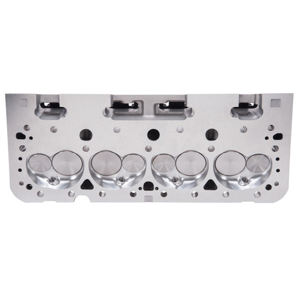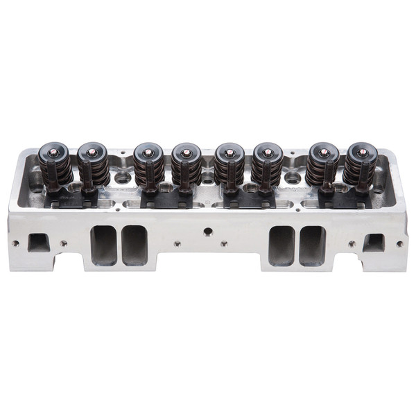 Edelbrock Victor Jr. 23° 220 cylinder heads are an affordable option that delivers maximum power in high-performance street and entry-level competition engines. Its 64cc combustion chamber yields around 10:1 compression ratio in a typical flat-top application and about 12.5:1 when used with some of the most common 12cc dome pistons. One of the key features of the Victor Jr. 23° 220 cylinder heads is the CNC machined chambers and bowls, which result in consistency and improved performance. They also feature angled spark plug holes and maintain the stock 23° valve angle as well as the intake flange bolt pattern for use with 1986 and earlier intake manifolds. All of this allows these cylinder heads to deliver 530-580 hp potential right-out-of-the-box, making them ideal for a budget minded engine build desiring a high quality cylinder head that still uses a stud and guide plate rocker system. Bare heads will have valve guides and seats installed, but will require final sizing and a valve job to match the valves to be used. ** Combustion chamber volume: 64cc; Intake runner volume: 220cc; Exhaust runner volume: 85cc; Intake valve diameter: 2.10"; Intake valve diameter: 2.10"; Exhaust valve diameter: 1.60"; Valve stem diameter: 5/16"; Valve guides: Manganese bronze; Deck thickness: 11/16"; Valve spring diameter: 1.55"; Valve spring maximum lift: 0.700"; Rocker stud: 7/16"; Guideplate: Hardended steel; Pushrod diameter: 5/16"; Valve angle: 23°; Exhaust port location: Raised .300"; Spark plug fitment: 14mm x 3/4 reach, gasket seat. ** INSTALLATION NOTE: Check cam manufacturers specs for compatibility with valve springs for spring rates. Match with Edelbrock head gasket sets or use Fel-Pro intake gasket #1206 and Fel-Pro exhaust gasket #1405. Requires hardened pushrods. Use Head Bolt Kits for easy installation. These heads require the use of a 14mm x 3/4in. reach, flat gasket spark plug with a heat range appropriate to your application.