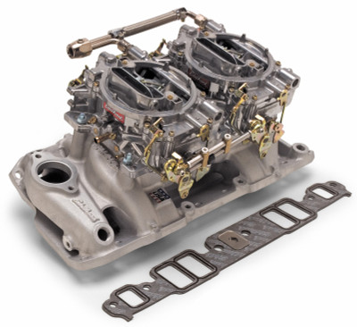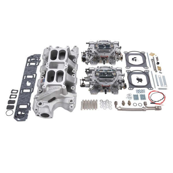 A huge hit among street rodders, these Dual-Quad Kits offer the ultimate set-up for anyone who wants the look and the performance of dual-quad carbs. They include an Edelbrock RPM or RPM Air-Gap Dual-Quad intake manifold and two 500 cfm Thunder Series AV.