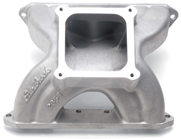 Intended for 375 c.i. and up high output drag race engines, this manifold was developed in conjunction with noted drag racer Billy Glidden and is specifically designed to complement the flow characteristics of fully ported 18° and 15° cylinder heads. It features a 4500 series carb flange, and the dividers are pulled back to increase plenum size and shorten the runners for improved high rpm performance. The runners are wider at the plenum, producing approximately 3.6 square inches area at the opening. Installation Notes: Must be used with Edelbrock base plate #2992. Recommended intake gasket: Edelbrock #7218 or Fel-Pro #1282 (spider and manifold), #1254 (base).
