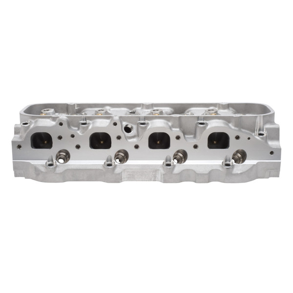 Cylinder Head Specifications: Combustion chamber volume: 118cc; Intake runner volume: 315cc; Exhaust runner volume: 110cc; Intake valve diameter: 2.19"; Exhaust valve diameter: 1.88"; Valve stem diameter: 11/32"; Valve guides: Manganese bronze; Deck thickness: 9/16"; Valve spring diameter: 1.55"; Valve spring maximum lift: .700"; Rocker stud: 7/16"; Guideplate: Hardened steel; Pushrod diameter: 3/8"; Valve angle: 26°; Exhaust port location: Stock; Spark plug fitment: 14mm x 3/4 reach, gasket seat. INSTALLATION NOTE: Bare heads will have valve guides & seats installed, but will require final sizing & a valve job to match the valves you will be using. Recommended spark plugs are Champion RC12YC or equivalent 14mm x 3/4" reach with flat gasket seat. All Performer and Performer RPM Big-Block Chevy heads: Spark plug is closer to center of bore, will interfere with high-dome pistons for open chamber heads. Use pistons designed for our heads. Match with Edelbrock head gasket sets.