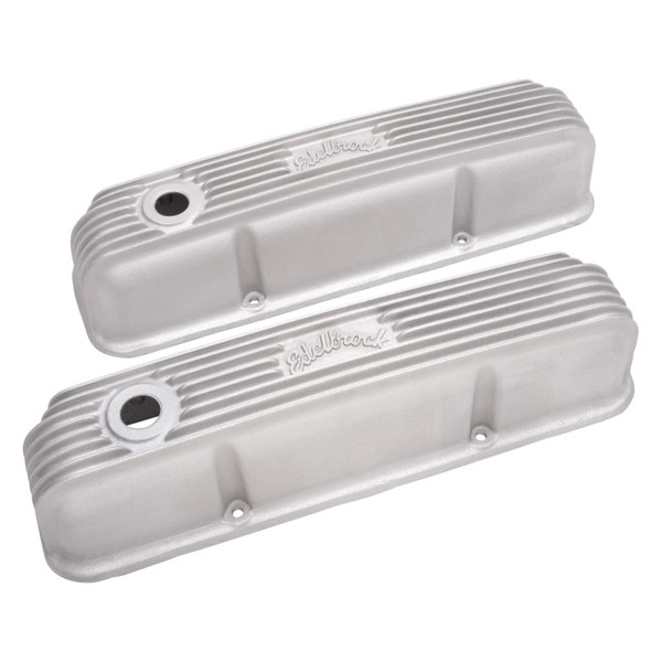 Edelbrock first made these aluminum valve covers in the late '50s and they're still a classic. Made of heavy-gauge sand-cast aluminum, our classic finned valve covers are available in either a classicpolished aluminum or durable black powder coated finish. Overall height is measured from base to top at the highest point. Edelbrock classic valve covers can be machined to accept breathers if desired.