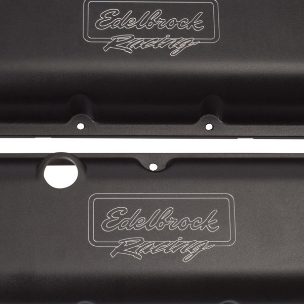 Our Victor Series valve covers have a black powder coated finish that features a finely textured surface for a pleasing and unique appearance. This is the same finish youll find on our top-of-the-line Edelbrock/Musi 555 Crate Engine. These valve covers are manufactured from die-cast aluminum and machined with 1-1/4 breather hole. Overall height is measured from base to top at the highest point.