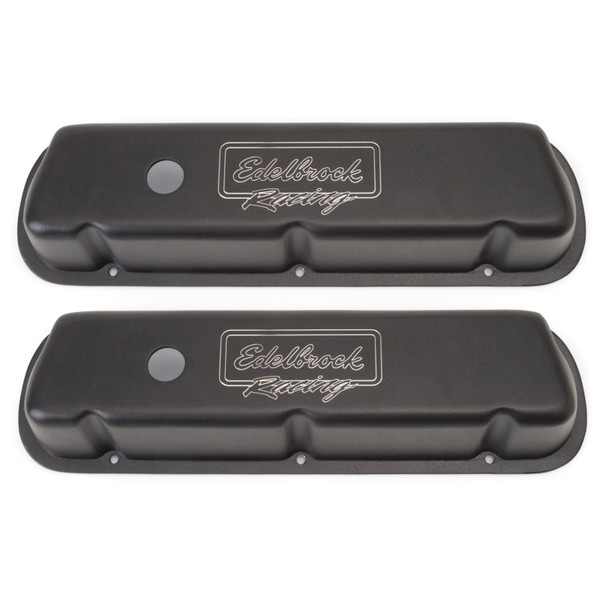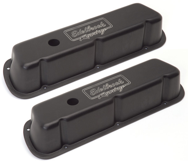 Our Victor Series valve covers have a black powder coated finish that features a finely textured surface for a pleasing and unique appearance. This is the same finish youll find on our top-of-the-line Edelbrock/Musi 555 Crate Engine. These valve covers are manufactured from die-cast aluminum and machined with 1-1/4 breather hole. Overall height is measured from base to top at the highest point.