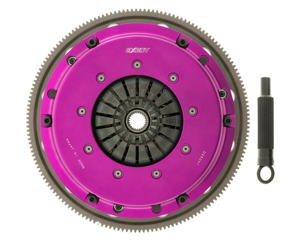 The EXEDY Hyper Single Series clutch is engineered to optimize the performance of cars that are moderately modified. Similar to our multi-plate clutches, it has a purple anodized, forged aluminum cover and maintains the pedal efforts at a reasonable level. Additionally, the pressure plate features a series of turbine-like vanes that keep the clutch cooler under extreme operating conditions. Hyper Single clutches come with a chromoly steel flywheel and a 6-puck cerametallic, sprung center damper disc assembly. However, on select vehicles, the new VF (Various Friction) disc may be offered. The chromoly flywheel is lighter than OEM for improved engine response. The disc is generally smaller and thinner than the OEM disc making for lower inertia and therefore quicker, easier shifting and less wear and tear on the transmission synchros. The higher clamp load and cerametallic friction facings give approximately twice the holding torque of the OEM clutch and higher than other single disc clutches. 6-Puck Cerametallic Disc: High friction coefficient, low wear, and a special heat resistant material [T5001] has been applied to enable the clutch size to be reduced which in turn lowers mass inertia and improves shift responses for faster gear. Durability is improved with the use of a stronger, smaller damper disc, designed especially for the Hyper Single clutch. VF (Various Friction) Disc: The VF enables the driver to operate the clutch through an easy-to-feel half engagement thanks to the Ultra Fiber friction material all while having a high heat dissipation and torque capacity due to the integrated metal facing. Furthermore, pedal effort has been drastically reduced and improved by the re-engineering and re-designing of the engagement point with newly developed cushioning plates. All EXEDY Racing Hyper Single Series Clutch Kits carry SFI 1.1 Certification. Which means, when you buy these products, you can be confident they are certified for use in competitive motorsports.