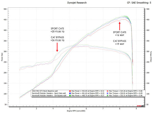 After extensive dyno development we found the optimal header length and diameter. With no tune, compared to a stock car we gained +19HP ? 16 whp (whp+ horsepower to the wheels) and 20 ft/lbs of TQ with the Sport Cats and +23HP / 19 whp and 26 ft/lbs of TQ with Cat Bypass installed. That's a gain of 19 HP and 23 HP, respectively, at the crank! Peak horsepower also increased from our baseline of 452 whp to 461 whp with our HJS Sport Cats and 468 whp with Cat Bypass Pipes. As you can easily SEE EMITEC HJS German tri-metallic catalytic converters deliver virtually all the CLEAN and Green Power that is wonderful. See our dyno graph above for more details.