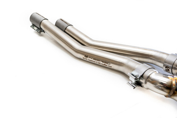 - Slip on system for rear section with front section X pipe that ties the exhaust together on both sides of the V6. The stock exhaust is 2 separate channels from from catalytic converters to tips. Fabspeed Motorsport USA included two ingenious Unique X pipes to harness the 6 cylinder engines exhaust pulse together to guarantee much better sound and power all in one!