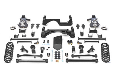 Fabtech has developed multiple systems for late model T900 platform SUV's and SUT's. Common to these systems is our proven one piece high arched lower crossmember design with an integrated differential skid plate for solid support of the front suspension. Special attention was given to the design of replacement extended length steering knuckles to keep the track width of the vehicle near stock while retaining turning radius for easy maneuverability in tight areas. All rear systems feature extended length tubular upper and lower link arms with an oversized Trac bar relocation bracket to properly place the axle under the vehicle with zero driveline vibration. AutoRide and non AutoRide specific rear coil springs maintain proper ride height on all models. The Basic System features the above mentioned components along with front strut assembly spacers and rear performance coil springs. This system provides a stock like ride and is compatible with all AutoRide models. Fabtech's Performance System provides the Dirt Logic 2.5 coilover front shocks for superior damping. This Performance system will provide a supple highway ride with outstanding offroad damping capabilities for the best of both worlds. Installation of all systems does not require relocation of the Rack and Pinion or disassembly of the front strut assemblies.