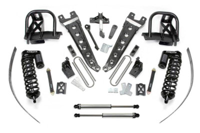 Obtain maximum front suspension damping for Super Duty's with our Dirt Logic 4.0 Stainless Steel Coilover Conversion system. The upper coilover mounts are constructed with 1.75 diameter DOM tubing that replaces the factory coil spring mounts and span across a wide section of the frame for proper impact load distribution. The lower mounts are 1/4'' thick steel that attach to the axle housing, providing solid mounting points for the Dirt Logic 4.0 Stainless Steel Coilover piggyback reservoir shocks. Also included in this system are billet sway bar end links with heim ends and quad layer limiting straps. Includes rear 2.25 Dirt Logic Stainless Steel shocks.
