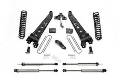 Fabtech?s 6? Radius Arm system for the Ford F450 and F550 Super Duty is built to handle the on and offroad demands of the truck enthusiast. This vehicle?s suspension is more robust than the Ford F250 and F350 and therefore demands specialty parts only available from Fabtech. This Radius Arm system is a complete upgrade to the factory suspension and will provide additional strength for use with oversized tires. High quality components with properly designed suspension geometry is what sets this system apart from all other Radius Arm suspensions. The Radius Arms use tubular construction with dimple die side plate for superior strength. American made coil springs have been designed for a very compliant ride quality both on and offroad. 1/4? thick steel bracketry repositions the factory track bar to center the axle under the vehicle with the increased lift height. The Dropped Pitman Arm uses forged steel construction with high strength material that exceeds the factory specifications. 1/4" thick steel drop brackets reposition the front sway bar for the increased ride height. This allows the sway bar link ends to fully cycle without binding throughout the extended travel range. Brake Line Brackets reposition the factory brake lines down on the frame for the new travel range without having to open the brake system. Keeps factory fluid system intact. Steering Stabilizer Brackets retain the factory F450 or F550 long travel steering stabilizer with a 1/4" thick steel bracket and support brace to help reduce tire shimmy. Steel rear lift blocks replaces the factory blocks for additional lift without changing the ride quality or load carrying capacity. American made U-Bolts designed to attach the entire rear differential to the vehicle. The Dirt Logic 2.25 Shocks are constructed of a stainless steel body with NitroSteel? piston rod for maximum corrosion resistance and durability. Superior ride quality both on and offroad.