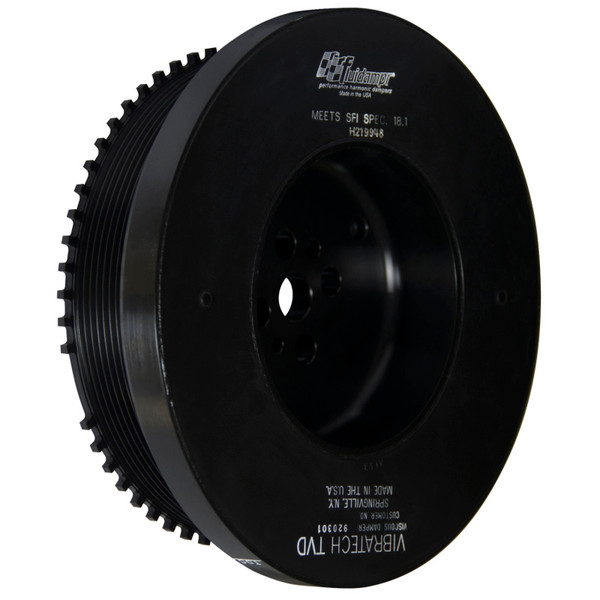 Serious power requires a serious damper. Protect your truck?s engine with the technology preferred by heavy duty diesel OEMs. Superior viscous damper design controls harmful torsional vibration across the entire rpm range. Reduce wear on engine components. Reduce risk of crankshaft failure. Improve timing. Unleash lost torque and horsepower. Competition built precision CNC machined and balanced high-grade steel components. Corrosion resistant black zinc finish with engraved timing marks. No maintenance required. Trusted by leading performance diesel engine builders worldwide. SFI 18.1 certified. Made in USA.