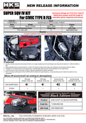 quick view Add to Cart HKS HKS SUPER SQV4 FL5 - 71008-KH012 MSRP: $454.99 Exclusive design for FL5 Civic Type R Relief-less system and full range of operation gives response and sound.Features:- Quickly relieves excess boost pressure that is no longer needed by the turbocharger and reduces the load on it. (When throttle is... Add to Cart Add to Wish List Add to My Wish List Create New Wish List Compare