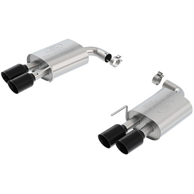 Features ultra-smooth mandrel bends, warp-free flanges and superior craftsmanship. 2.25 in. stainless steel mandrel bent tubing; 4 in. chrome-plated stainless steel tips. Uses Stock hangers and mounts. Factory exhaust pipe must be cut to install clamp on Ford Performance axle back mufflers.