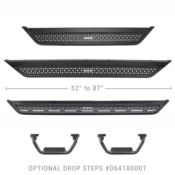 The Go Rhino Dominator D6 is a cab length body mount rock slider with a wide step area designed for the hardcore off-roader. These optional bolt-on 4” drop steps for the D6 help make entering and exiting a lifted vehicle with oversize tires much easier, especially if it is doing extra duty as family transport. Sold in pairs. The D6 Side Steps come with a Limited Lifetime warranty on materials and construction and a 5 year warranty on the Textured Black Finish.