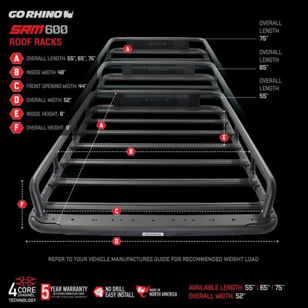 SRM500 is a 65" long x 52" wide flat roof rack with channeled aluminum cross bars to mount accessories like shovels, axes, quick fist clamps, paddleboards, kayaks, tents, bicycles, and other...