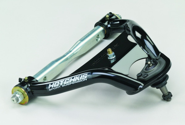 Hotchkis Sport Suspension 1106 1970-1981 Camaro/Firebird Tubular Upper A-Arms. Install the geometry corrected Hotchkis Sport Suspension Tubular Upper A-Arms on your 70-81 Camaro or Firebird and gain vastly increased handling and control. These TIG-welded bolt-on arms offer increased camber and caster adjustment over stock for ultimate driving performance. Finished in gloss black powder coat the Arms are ready to install and are complete with ball joints offset cross-shafts and smooth operating Delrin bushings. Exceptional handling performance when combined with the Hotchkis Sport Suspension Tubular Lower A-Arms. Features: Geometry corrected design. Built in - 1.1 deg of Camber 5.2 deg of Caster 100% TIG-welded 1.25 in. tubular steel construction. Silver zinc plated 4130 Chromoly billet cross-shaft. Easy to lubricate Delrin bushings. Upper ball joints and polyurethane droop stops installed. Laser cut Hotchkis logo. Gloss black powder coat finish Benefits: Offset Cross-Shaft allows increased static negative camber without a large alignment shim stack. Great for header clearance issues. Increased Caster improves high speed stability and camber gain during turning thereby increasing front tire traction. Smooth operating Delrin bushings allow minimal deflection through travel range. Achievable specs when using 1106 upper control arm and 1108 lower control arm. MAX Caster with Uppers and Lowers = 9 deg MAX Camber with Uppers and Lowers = - 3.5 deg