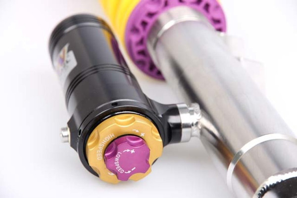 Using the Nordschleife as it's testing grounds and the 7-post rig, KW developed it's V4 Clubsport coilover kit. Wheel loads, vehicle weight and chassis reinforcements (increased body stiffness) can all be taken into consideration with Adjustment -capabilities of the V4 Clubsport. The KW Clubsport coilovers combine KW's high-end racing technology -with maintenance-free KW OEM quality components. Designed to provide you the ideal product to utilize the full potential of your sports car during autocross, track days, high performance drivers education (HPDE) courses, club racing, and is tested rigorously on race tracks such as the Nurburgring Nordschleife. Race teams rely on KW's racing expertise and experience for their vehicle setup. This same championship winning pedigree is mirrored in the development of each one of the KW Clubsport coilover systems. Similar to the KW Competition suspension used in international motorsports, the KW V4 Clubsport coilover kit allows fine tuning of the compression damping separately in the low-speed and high-speed range. The click adjustments of the TVCLH-A valve technology -ake for easy Adjustment -directly on the reservoir. You can modify the low-speed compression damping with 6 precise clicks with the purple low speed Adjustment -ial and directly beneath it the golden Adjustment -heel provides an additional 14 precise clicks of high speed compression adjustment. In addition, the TVR-A technology -provides 16 clicks to noticeably adjust the rebound damping independently of the compression damping. If you would like to adjust the KW V4 Clubsport coilover kit it can easily be adjusted for more comfort or to an alternative setup for a new race track. The KW V4 Clubsport benefits from the same motorsports technology -hat has proven its endurance with multiple overall wins at the ADAC Zurich 24h Nurburgring race.