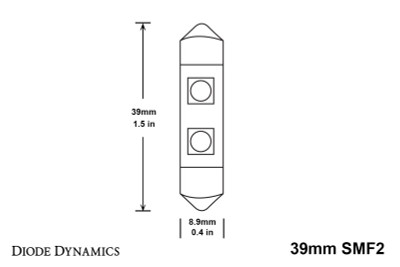 quick view Add to Cart Diode Dynamics Diode Dynamics 39mm SMF2 LED Bulb Warm - White (Single) - DD0090S MSRP: $22.99 Direct replacement for your factory bulb. Molded construction with sturdy double terminals. Increased output with LED Appearance. Plug and play simple installation. Add to Cart Add to Wish List Add to My Wish List Create New Wish List Compare