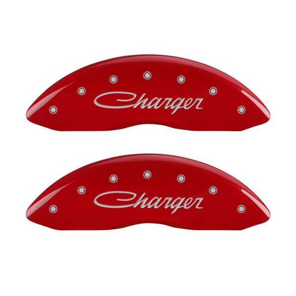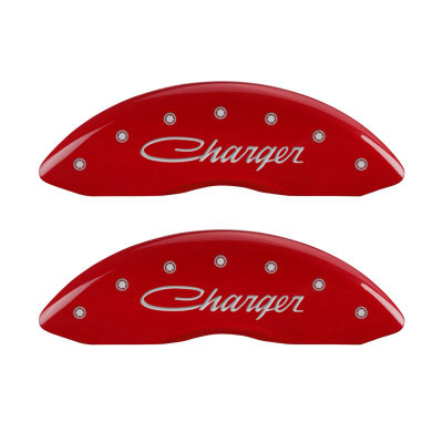 MGP 4 Caliper Covers Engraved Front & Rear Cursive/Charger Red finish silver ch - 12181SCHSRD