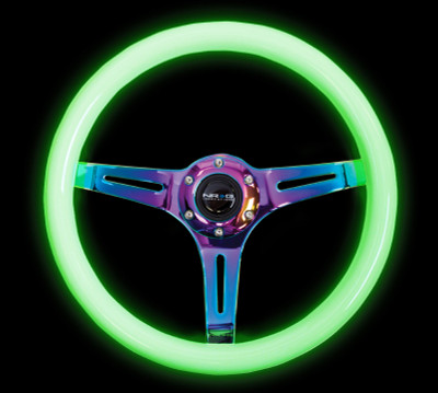 NRG Classic Wood Grain Steering Wheel (350mm) Glow-In-The-Dark Blue Grip w/Black 3-Spoke Center