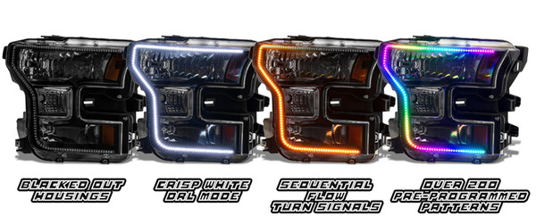 The new Black Edition 2015-2017 Ford F-150 DYNAMIC ColorSHIFT headlights from ORACLE Lighting. These complete replacement headlights pack a TON of innovative features such as Blacked-Out Housings, Sequential FLOW Turn Signals, White DRL mode, and Smartphone Control all in one package! Dynamic ColorSHIFT headlights feature individually addressable LEDs which pack a ton of unique features. The Dynamic features allow the user to run multiple moving color patterns through the LEDs, creating a vivid eye-catching lighting effect.The integrated Controller features both DRL and Turn Indicator inputs. The SWITCHBACK LED indicator features our exclusive Dynamic FLOW turn signal effect. The White DRL trigger automatically switches the LEDs to pure White when you start the vehicle (connect DRL trigger to ignition switched source) The color-changing motion flow effects are conveniently controlled through a free smartphone App, the system features over 200 pre-programmed moving patterns as well as static color control and color wheel. Installation:New user-friendly design is a simple plug and play design making wiring easy for even a novice. Simply connect the ring terminals to the + and - battery terminals then control your lights from the smartphone app.