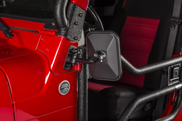 The new Rugged Ridge Stubby Quick Disconnect Mirrors give you the visibility you need for safe driving when you take the doors off your JK, but with a new "stubby" arm; delivering a narrower, more off-road friendly profile. Each mirror arm is reduced by three inches, allowing the mirror to hug more tightly to the vehicles body. Available with both round and rectangular mirror heads, Rugged Ridge Stubby Mirrors textured black powder coat looks great on any paint color and installs easily with the included mounting hardware. When it's time to put the doors back on, these mirrors can be removed quickly with a few turns of the convenient thumb screw. A convenient bolt-on mirror solution for when you want to leave the doors at home - also great with tube or safari doors. Includes a pair of mirror heads, mirror arms, mounting brackets, bushings, thumbscrews, gaskets and hardware.