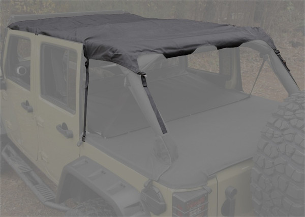 The Montana Pocket island Topper is engineered to provide cooling shade to both front and rear seat passengers enhancing the overall open-air driving experience. This new design features tough black diamond fabric combined with a pair of handy zippered front pockets and one large rear pocket that provide convenient and discrete storage on 2010-2018 Wrangler JKU models. Unlike many other summer tops on the market, the Rugged Ridge Montana design features wider side hook and loop fastener straps, a reinforced front section and extra heavy duty nylon tie down straps for a secure fitment. Requires use of an aftermarket windshield header, like 13308.06, for installation.