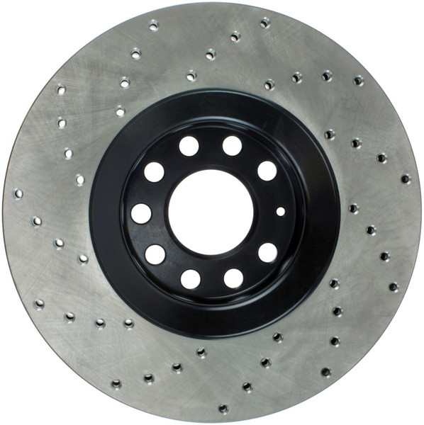 StopTech Drilled Sport Rotors are 1-piece direct replacement brake discs for factory brake systems and stock calipers that look great behind your wheels – and offer significantly improved braking performance. The unique cross-drilling aids with heat and brake dust dispersal, prevents glazing of the pads, adds bite and improves wet and dry braking performance. Built to last, the black e-coating provides protection from corrosion and the high carbon metallurgy (in most applications) offers quieter operation, better crack resistance and increased performance.