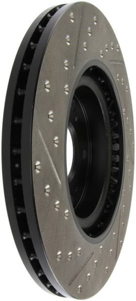 StopTech Drilled and Slotted Sport Rotors are 1-piece direct replacement brake discs for factory brake systems and stock calipers that look great behind your wheels – and offer significantly improved braking performance. The unique cross-drilling and slotting aids with heat and brake dust dispersal, prevents glazing of the pads, adds bite and improves wet and dry braking performance. Built to last, the black e-coating provides protection from corrosion and the high carbon metallurgy (in most applications) offers quieter operation, better crack resistance and increased performance.