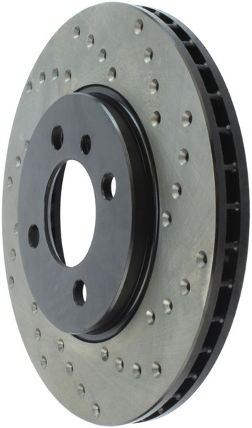 StopTech Drilled Sport Rotors are 1-piece direct replacement brake discs for factory brake systems and stock calipers that look great behind your wheels – and offer significantly improved braking performance. The unique cross-drilling aids with heat and brake dust dispersal, prevents glazing of the pads, adds bite and improves wet and dry braking performance. Built to last, the black e-coating provides protection from corrosion and the high carbon metallurgy (in most applications) offers quieter operation, better crack resistance and increased performance.