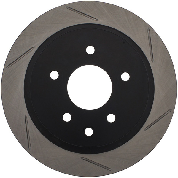StopTech Slotted Sport Rotors are 1-piece direct replacement brake discs for factory brake systems and stock calipers that look great behind your wheels – and offer significantly improved braking performance. The unique slotting aids with heat and brake dust dispersal, prevents glazing of the pads, adds bite and improves wet and dry braking performance. Built to last, the black e-coating provides protection from corrosion and the high carbon metallurgy (in most applications) offers quieter operation, better crack resistance and increased performance.
