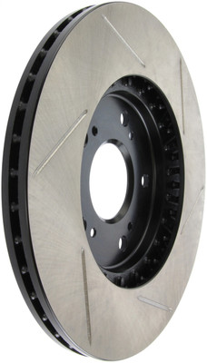 StopTech Slotted Sport Rotors are 1-piece direct replacement brake discs for factory brake systems and stock calipers that look great behind your wheels – and offer significantly improved braking performance. The unique slotting aids with heat and brake dust dispersal, prevents glazing of the pads, adds bite and improves wet and dry braking performance. Built to last, the black e-coating provides protection from corrosion and the high carbon metallurgy (in most applications) offers quieter operation, better crack resistance and increased performance.