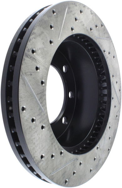 StopTech Drilled and Slotted Sport Rotors are 1-piece direct replacement brake discs for factory brake systems and stock calipers that look great behind your wheels – and offer significantly improved braking performance. The unique cross-drilling and slotting aids with heat and brake dust dispersal, prevents glazing of the pads, adds bite and improves wet and dry braking performance. Built to last, the black e-coating provides protection from corrosion and the high carbon metallurgy (in most applications) offers quieter operation, better crack resistance and increased performance.