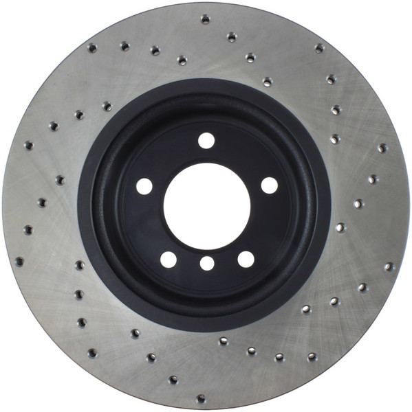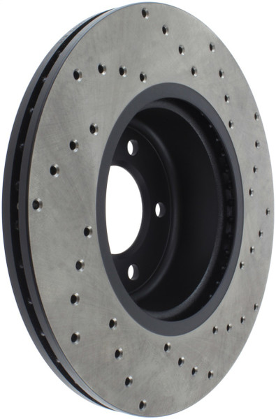 StopTech Drilled Sport Rotors are 1-piece direct replacement brake discs for factory brake systems and stock calipers that look great behind your wheels – and offer significantly improved braking performance. The unique cross-drilling aids with heat and brake dust dispersal, prevents glazing of the pads, adds bite and improves wet and dry braking performance. Built to last, the black e-coating provides protection from corrosion and the high carbon metallurgy (in most applications) offers quieter operation, better crack resistance and increased performance.