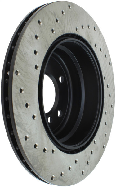 StopTech Drilled Sport Rotors are 1-piece direct replacement brake discs for factory brake systems and stock calipers that look great behind your wheels – and offer significantly improved braking performance. The unique cross-drilling aids with heat and brake dust dispersal, prevents glazing of the pads, adds bite and improves wet and dry braking performance. Built to last, the black e-coating provides protection from corrosion and the high carbon metallurgy (in most applications) offers quieter operation, better crack resistance and increased performance.