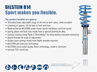 quick view Add to Cart Bilstein Bilstein B14 (PSS) Front & Rear Performance Sus System 2015 VW Golf w/ 50mm Outside Dia Strut - 47-229945 MSRP: $1,794.00 $1,261.99 Bilstein B14 (PSS) suspension kits feature ride height adjustability in an OE quality, direct fit package. These kits offer monotube performance dampers with matched springs that are tuned for each specific application. The zinc coated and threaded body... Add to Cart Add to Wish List Add to My Wish List Create New Wish List Compare